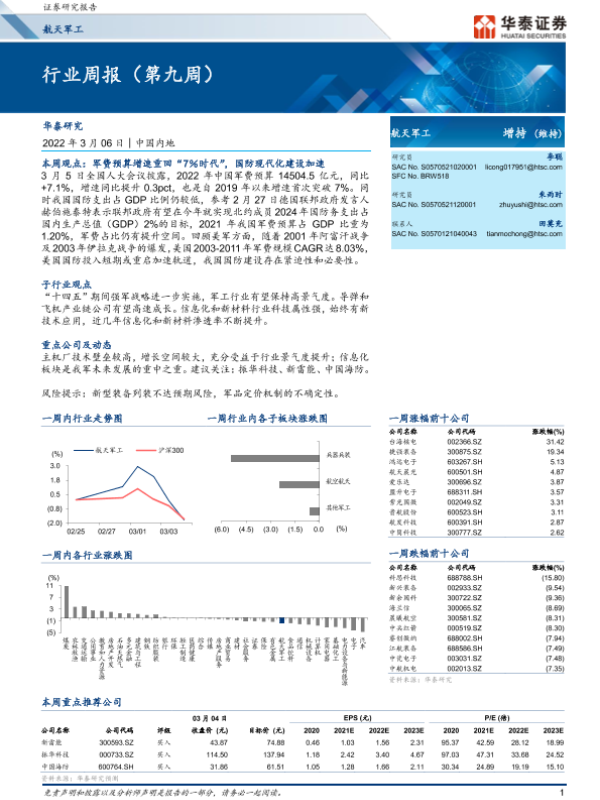 【华泰证券】【20220306】20220306-华泰证券-航天军工行业周报(第九周)-14页 行业研究