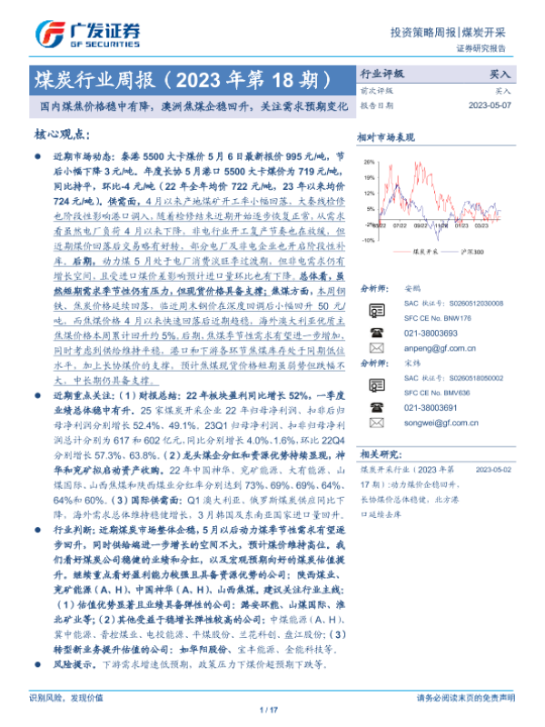 【广发证券】【20230507】20230507-广发证券-煤炭行业周报(2023年第18期):国内煤焦价格稳中有降,澳洲焦煤企稳回升,关注需求预期变化-17页 行业研究
