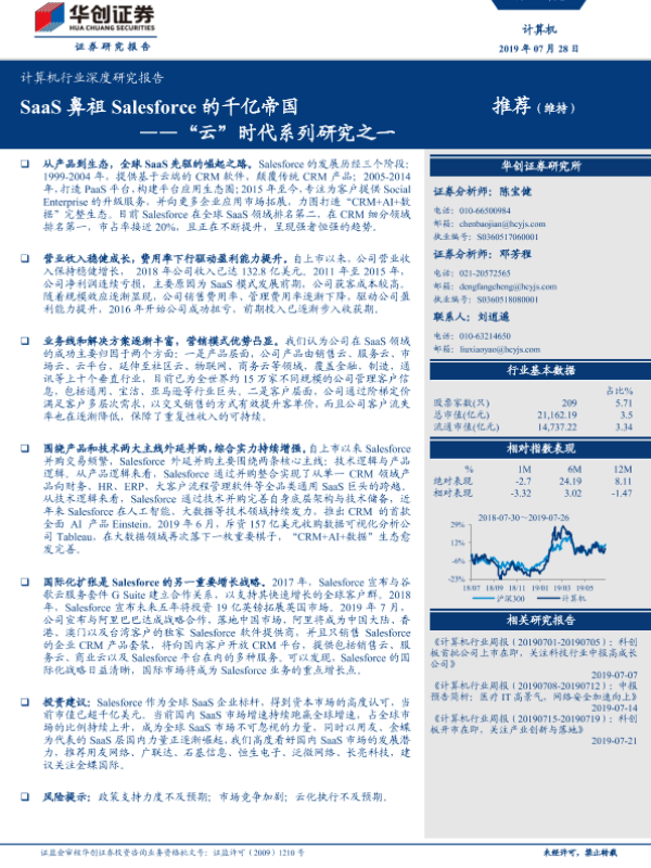 【华创证券】【20190728】计算机行业深度研究报告:“云”时代系列研究之一-SaaS鼻祖Salesforce的千亿帝国-31页 行业研究