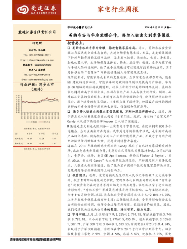 【爱建证券】【20190812】家电行业周报:美的布谷与华为荣耀合作,海尔入驻意大利零售渠道-11页 行业研究