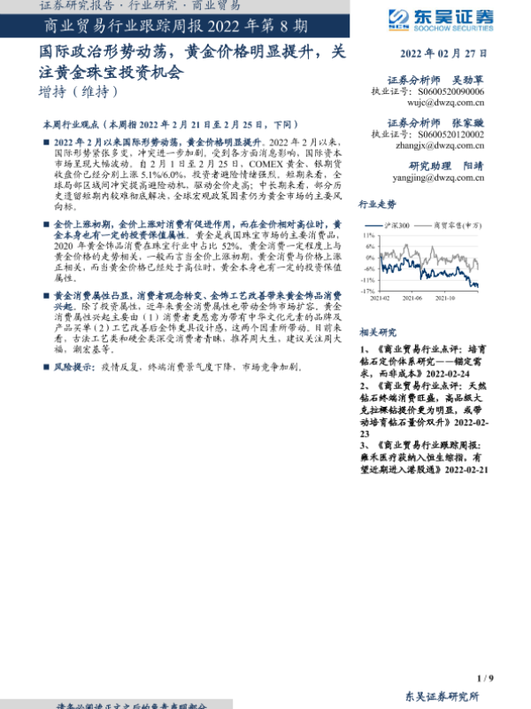 【东吴证券】【20220227】商业贸易行业跟踪周报2022年第8期:国际政治形势动荡,黄金价格明显提升,关注黄金珠宝投资机会-9页 行业研究