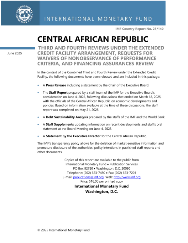 【国际货币基金组织】【202506】CENTRAL AFRICAN REPUBLIC THIRD AND FOURTH REVIEWS UNDER THE EXTENDED CREDIT FACILITY ARRANGEMENT, REQUESTS FOR WAIVERS OF NONOBSERVANCE OF PERFORMANCE CRITERIA, AND FINANCING ASSURANCES REVIEW-126页