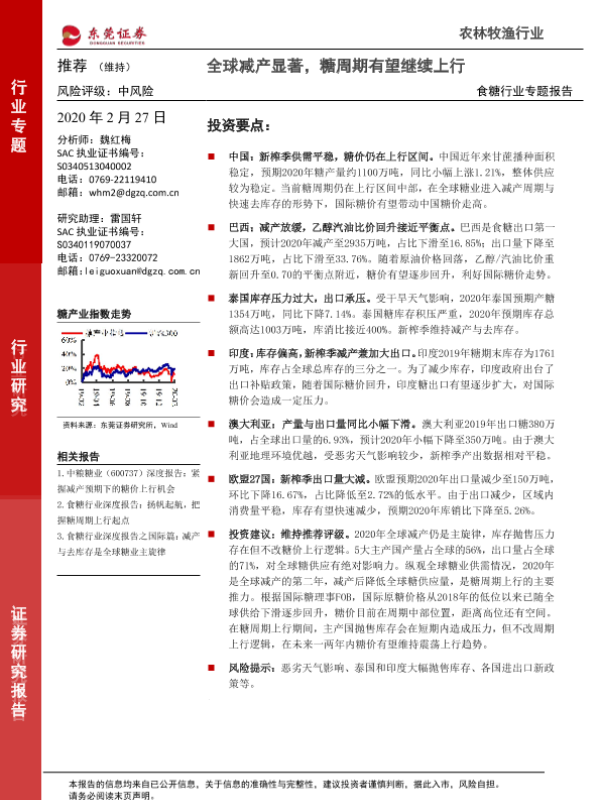 【东莞证券】【20200227】20200227-东莞证券-食糖行业专题报告:全球减产显著,糖周期有望继续上行-27页 行业研究