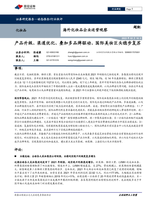 【国信证券】【20220216】2022.02.16-海外化妆品企业运营观察:产品升级、渠道优化、叠加多品牌驱动,国际美妆巨头稳步复苏-15页 行业研究