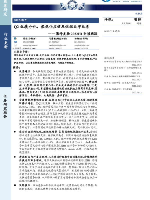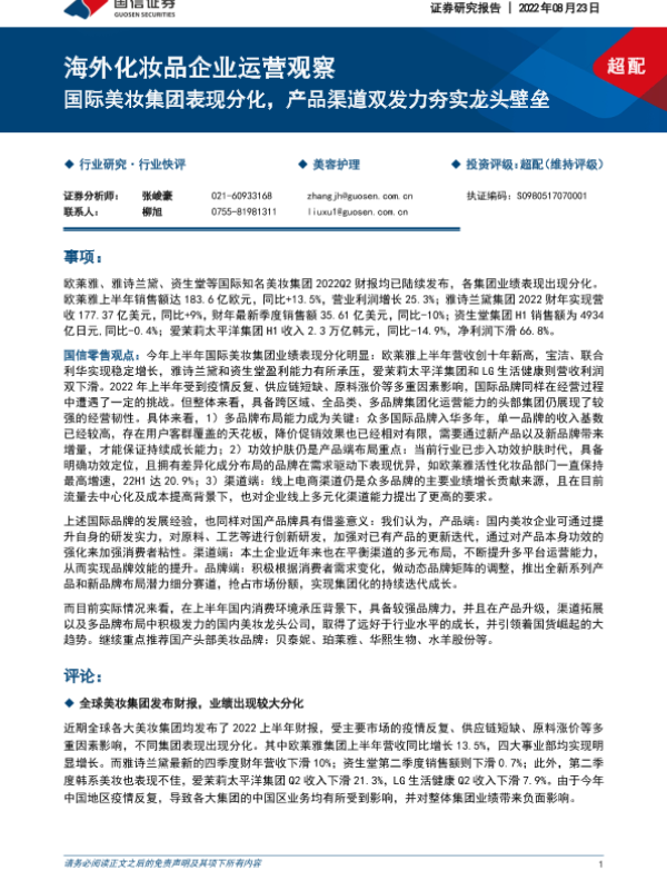 【国信证券】【20220823】海外化妆品企业运营观察:国际美妆集团表现分化,产品渠道双发力夯实龙头壁垒-11页 行业研究