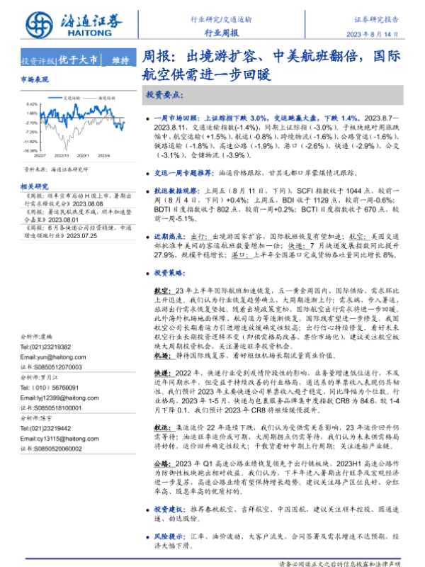 【海通证券】【20230813】招商交运物流行业周报:国际航班有望恢复提速,出行修复支撑油运旺季需求-18页 行业研究