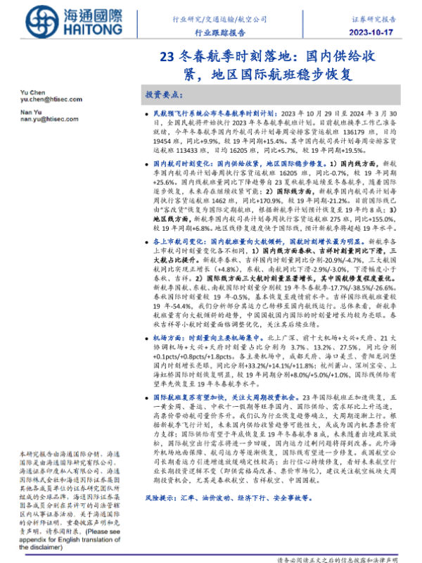 【海通国际】【20231017】23冬春航季时刻落地:国内供给收紧,地区国际航班稳步恢复-11页 行业研究