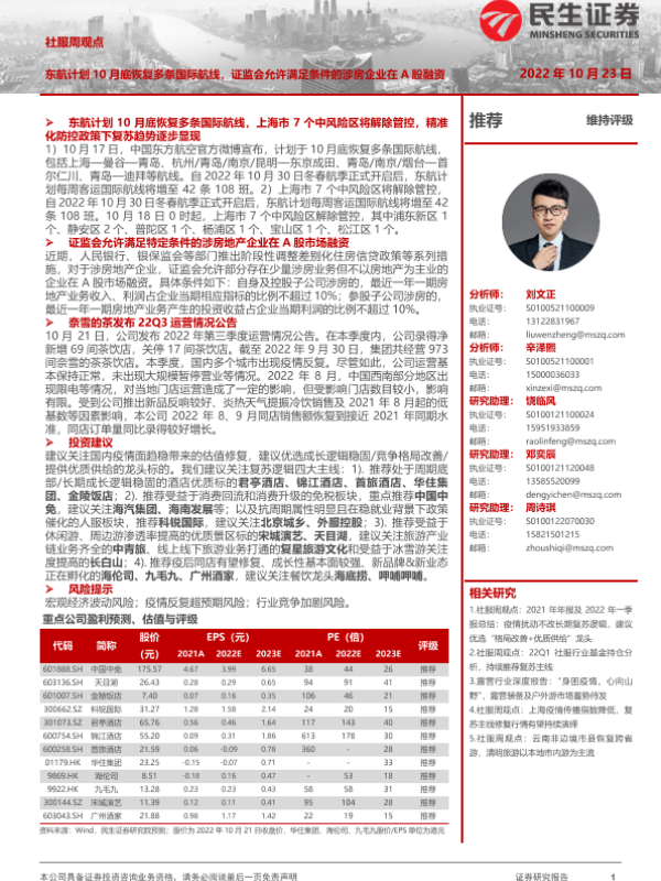 【民生证券】【20221023】社服行业周观点:东航计划10月底恢复多条国际航线,证监会允许满足条件的涉房企业在A股融资-22页 行业研究