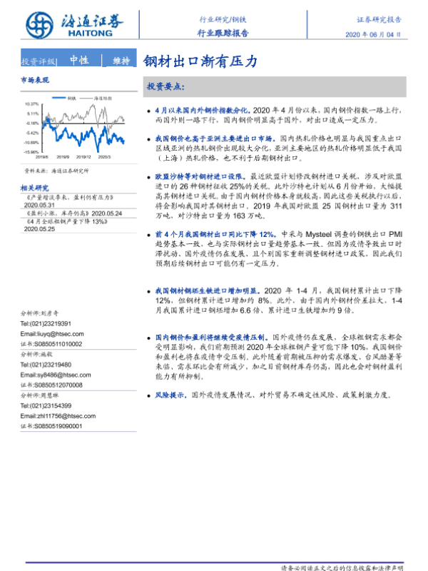 【海通证券】【20200604】20200604-海通证券-钢铁行业跟踪报告:钢材出口渐有压力-5页 行业研究
