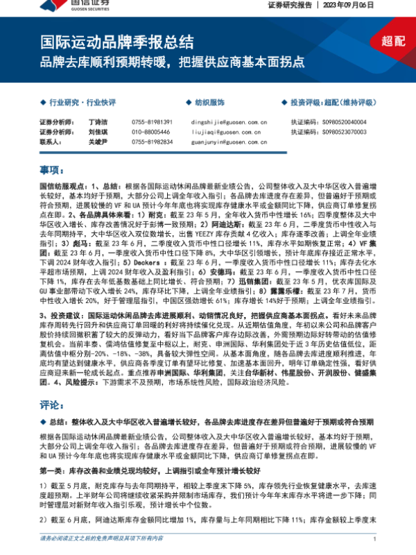 【国信证券】【20230906】纺织服饰:国际运动品牌季报总结-品牌去库顺利预期转暖,把握供应商基本面拐点-16页 行业研究