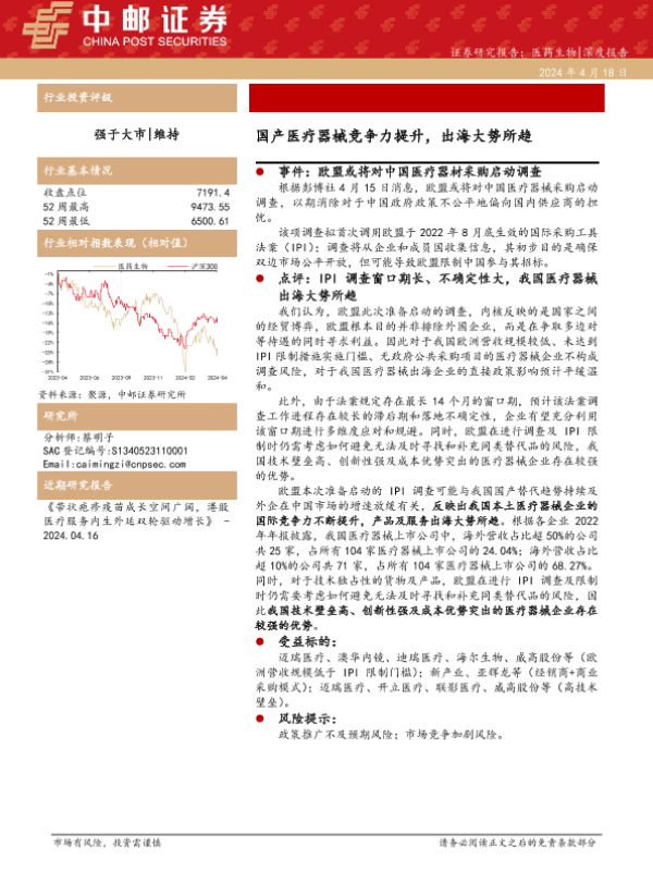 【中邮证券】【20240418】医药生物行业深度报告:国产医疗器械竞争力提升,出海大势所趋-8页 行业研究