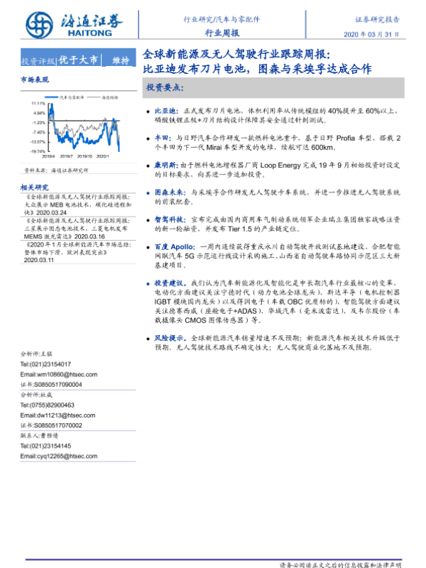 【海通证券】【20200331】全球新能源及无人驾驶行业跟踪周报:比亚迪发布刀片电池,图森与采埃孚达成合作-5页 行业研究