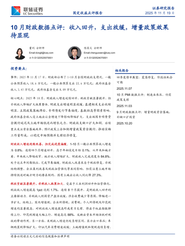 【联储证券】【202511】10月财政数据点评:收入回升,支出放缓,增量政策效果待显现-6页 证券期货研究报告
