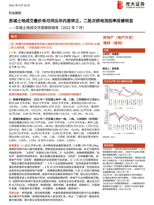 【光大证券】【20220818】百城土地成交月度跟踪报告:百城土地成交量价单月同比年内首转正,二批次供地流拍率改善明显-16页 行业研究