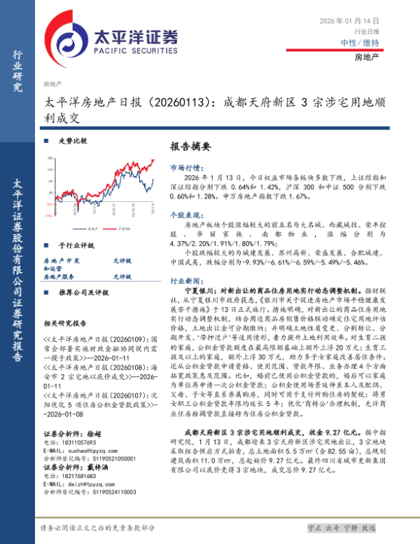【太平洋证券】【202601】太平洋房地产日报(20260113):成都天府新区 3宗涉宅用地顺利成交-4页 行业研究