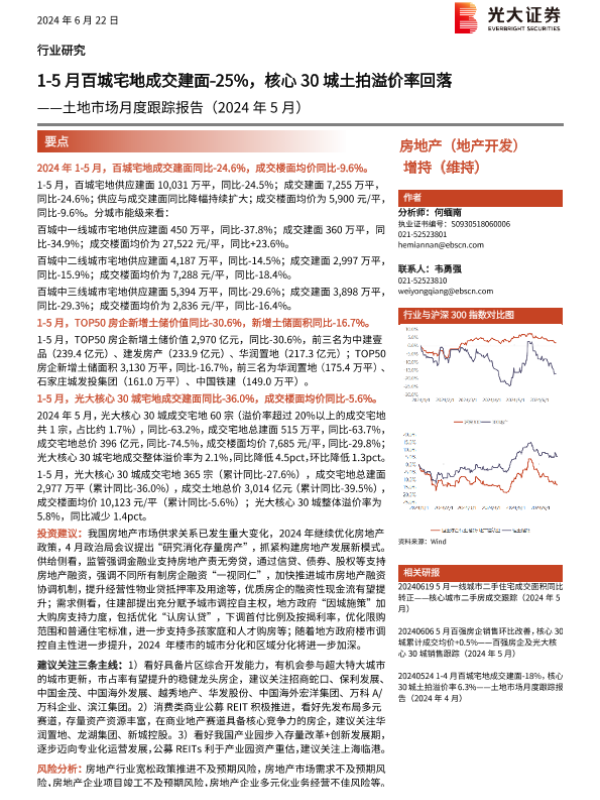 【光大证券】【20240622】土地市场月度跟踪报告:1-5月百城宅地成交建面-25%,核心30城土拍溢价率回落-15页 行业研究