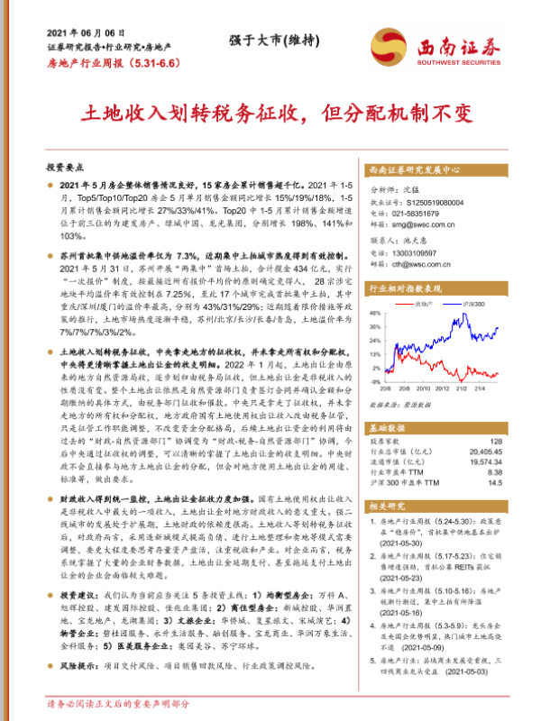 【西南证券】【20210606】房地产行业周报:土地收入划转税务征收,但分配机制不变-15页 行业研究