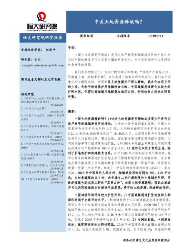 【恒大研究院】【20190923】中国土地资源稀缺吗?-21页 行业研究