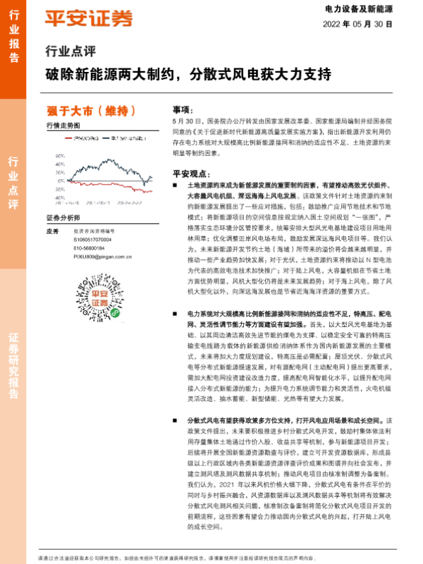 【平安证券】【20220530】电力设备及新能源行业点评:破除新能源两大制约,分散式风电获大力支持-3页 行业研究