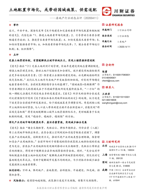 【川财证券】【20200411】土地配置市场化,或带动因城施策、供需适配-2页 证券期货研究报告