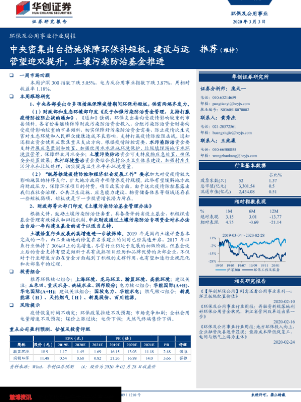 【华创证券】【20200303】环保及公用事业行业周报:中央密集出台措施保障环保补短板,建设与运营望迎双提升,土壤污染防治基金推进-31页 行业研究