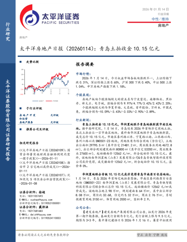 【太平洋证券】【202601】太平洋房地产日报(20260114):青岛土拍收金 10.15亿元-4页 证券期货研究报告