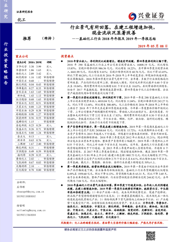 【兴业证券】【20190508】行业景气有所回落,在建工程增速加快,现金流状况显著改善——基础化工行业2018年年报及2019年一季报总结-44页 行业研究