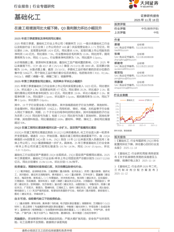 【天风证券】【202511】基础化工行业专题研究:在建工程增速同比大幅下降,Q3盈利能力环比小幅回升-23页 证券期货研究报告