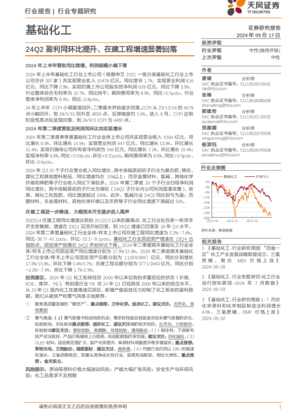 【天风证券】【20240917】基础化工行业专题研究:24Q2盈利同环比提升、在建工程增速显著回落-24页 行业研究