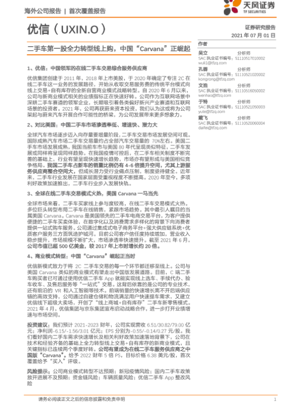 【天风证券】【20210701】优信:二手车第一股全力转型线上购,中国“Carvana”正崛起-21页 行业研究