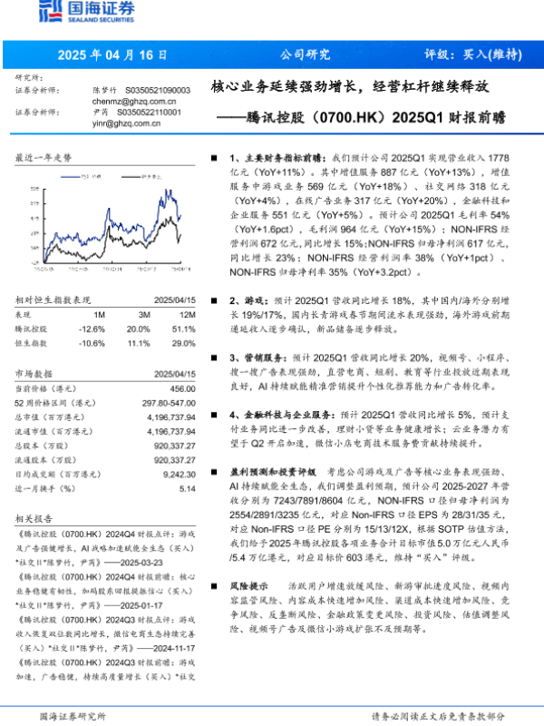 【国海证券】【20250416】腾讯控股(0700.HK)2025Q1财报前瞻:核心业务延续强劲增长,经营杠杆继续释放-11页 证券期货研究报告