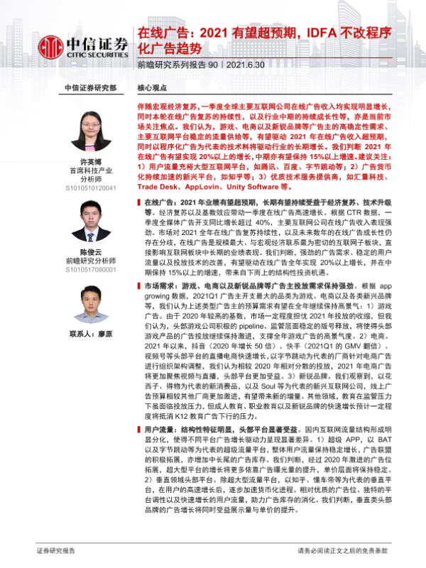 【中信证券】【20210630】在线广告:2021有望超预期,IDFA不改程序化广告趋势-26页 行业研究