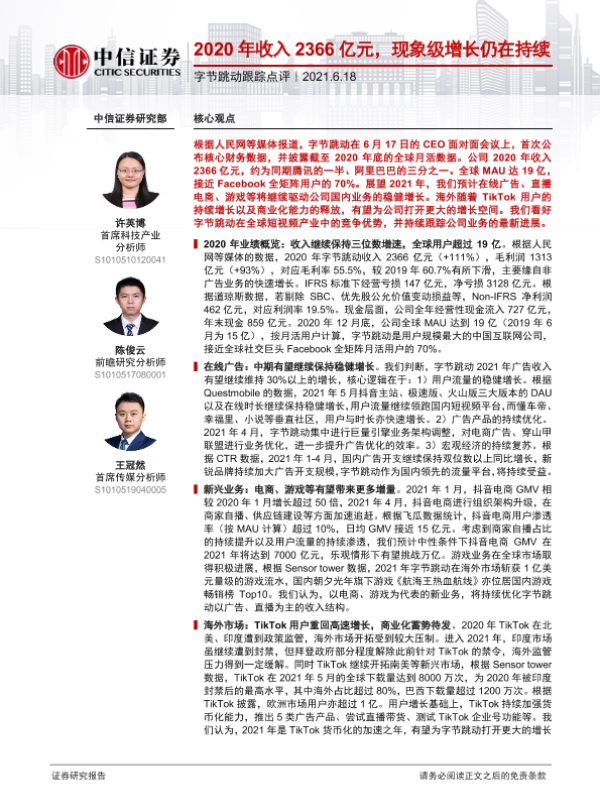 【中信证券】【20210618】20210618-中信证券-传媒:字节跳动跟踪点评-2020年收入2366亿元,现象级增长仍在持续-8页 行业研究