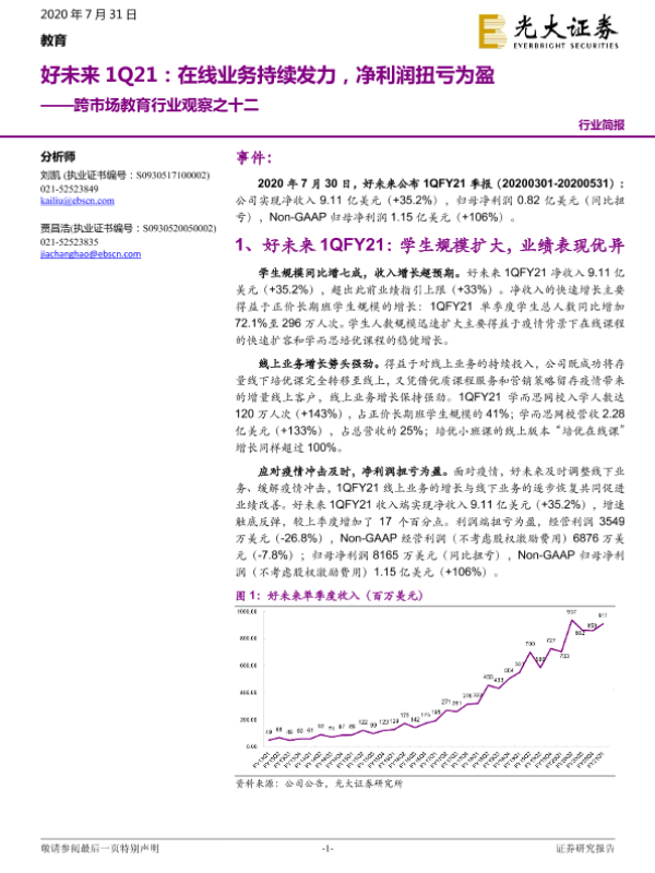 【光大证券】【20200731】跨市场教育行业观察之十二:好未来1Q21:在线业务持续发力,净利润扭亏为盈-6页 行业研究