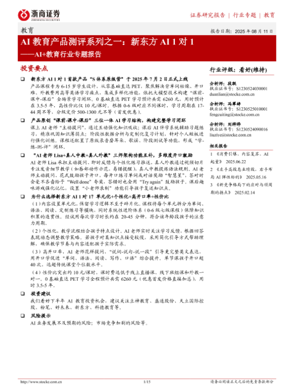 【浙商证券】【202508】AI教育产品测评系列之一:新东方 AI 1对 1——AI+教育行业专题报告-15页 证券期货研究报告