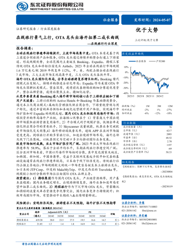 【东北证券】【20240507】在线旅行行业深度:在线旅行景气上行,OTA龙头出海开拓第二成长曲线-60页 行业研究