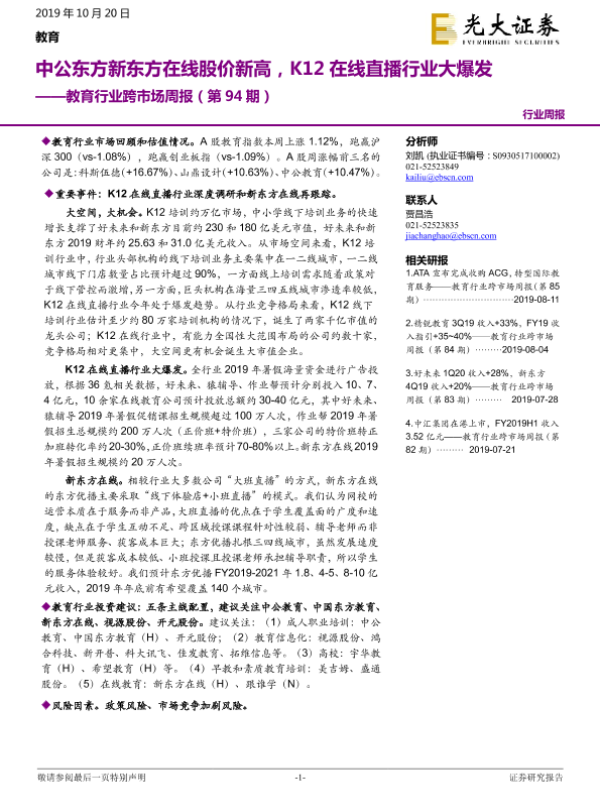 【光大证券】【20191020】教育行业跨市场周报(第94期):中公东方新东方在线股价新高,K12在线直播行业大爆发-13页 行业研究