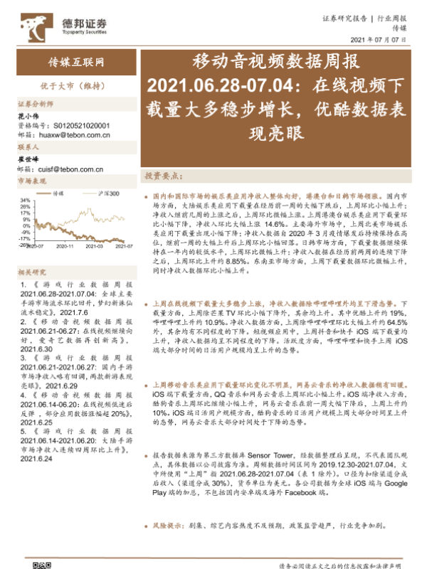 【德邦证券】【20210707】移动音视频数据周报:在线视频下载量大多稳步增长,优酷数据表现亮眼-16页 行业研究