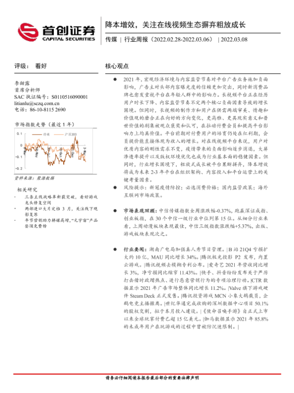 【首创证券】【20220308】降本增效,关注在线视频生态摒弃粗放成长-15页 行业研究