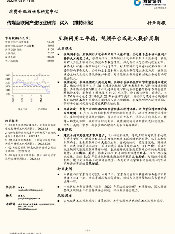 【国金证券】【20220411】传媒互联网产业行业研究:互联网用工平稳,视频平台或进入提价周期-16页 行业研究