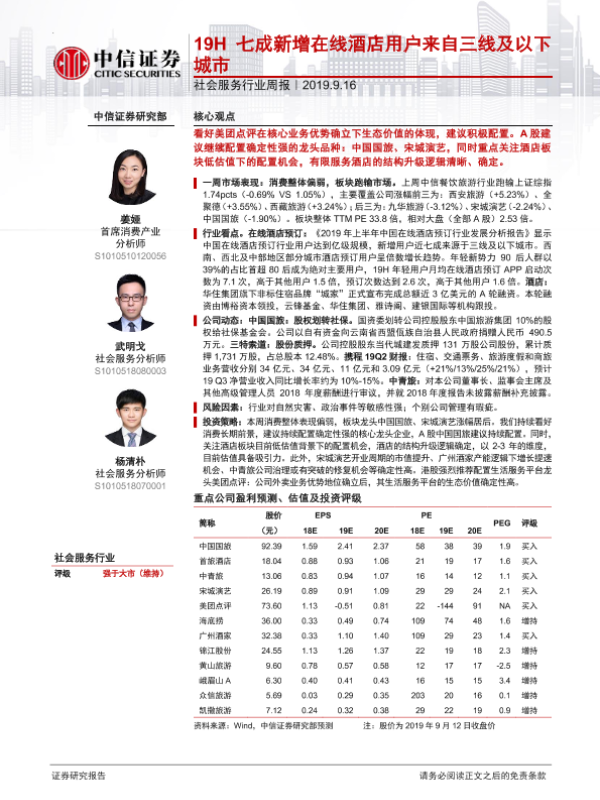 【中信证券】【20190916】社会服务行业周报:19H七成新增在线酒店用户来自三线及以下城市-11页 行业研究