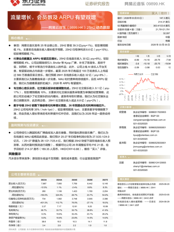 【东方证券】【202603】流量增长,会员数及ARPU有望双增——网易云音乐(9899.HK)25H2动态跟踪-5页 证券期货研究报告