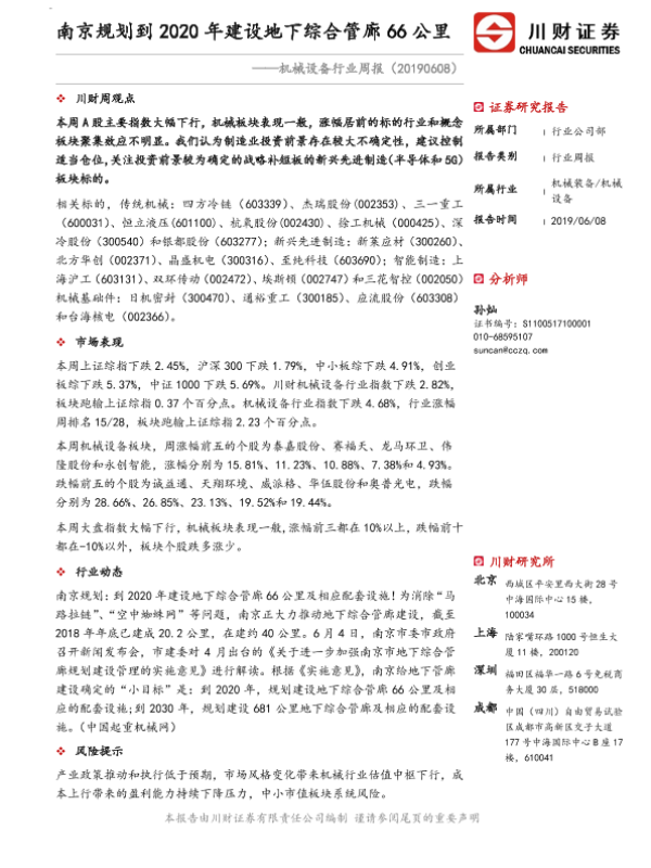 【川财证券】【20190608】机械设备行业周报:南京规划到2020年建设地下综合管廊66公里-8页 行业研究