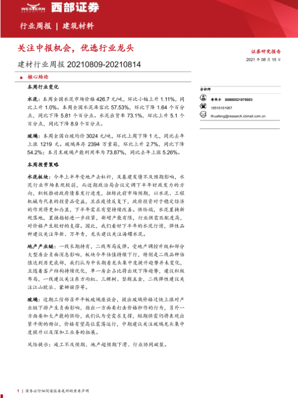 【西部证券】【20210815】建材行业周报:关注中报机会,优选行业龙头-16页 行业研究