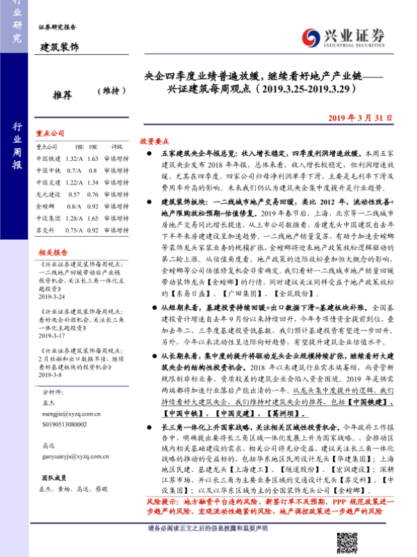 【兴业证券】【20190331】建筑装饰行业周报:央企四季度业绩普遍放缓,继续看好地产产业链-23页 行业研究