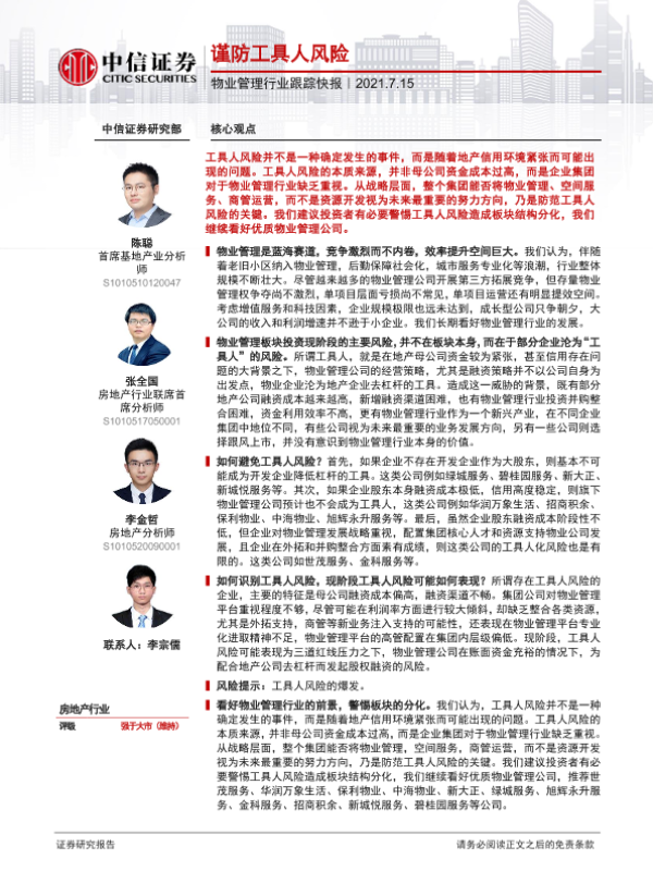 【中信证券】【20210715】物业管理行业跟踪快报:谨防工具人风险-5页 行业研究