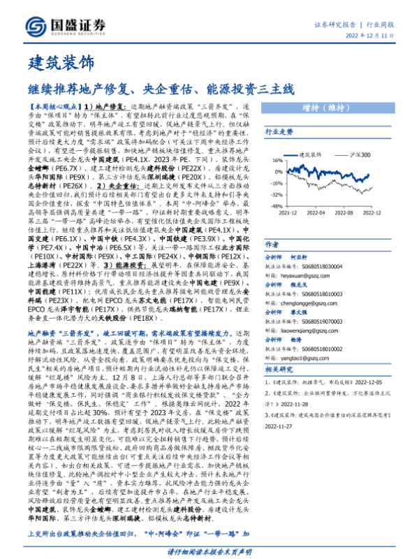 【国盛证券】【20221211】建筑装饰行业周报:继续推荐地产修复、央企重估、能源投资三主线-14页 行业研究