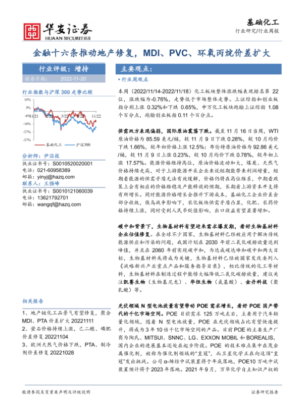 【华安证券】【20221120】20221120-华安证券-基础化工行业周报:金融十六条推动地产修复,MDI、PVC、环氧丙烷价差扩大-43页 行业研究