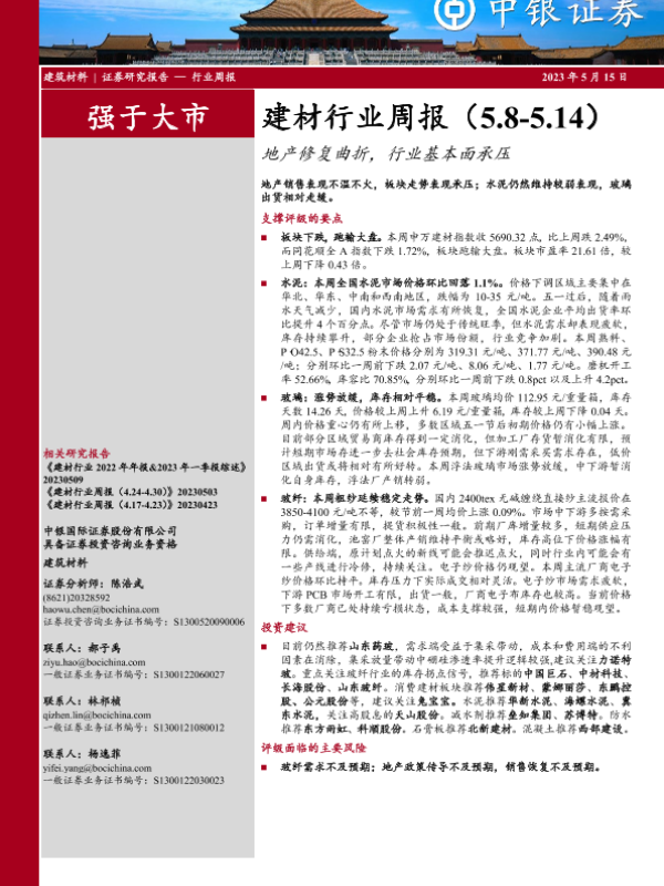 【中银证券】【20230515】建材行业周报:地产修复曲折,行业基本面承压-18页 行业研究