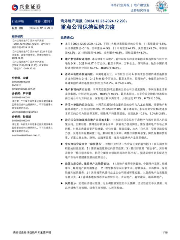 【兴业证券】【20241229】海外地产周报:重点公司保持回购力度-16页 行业研究